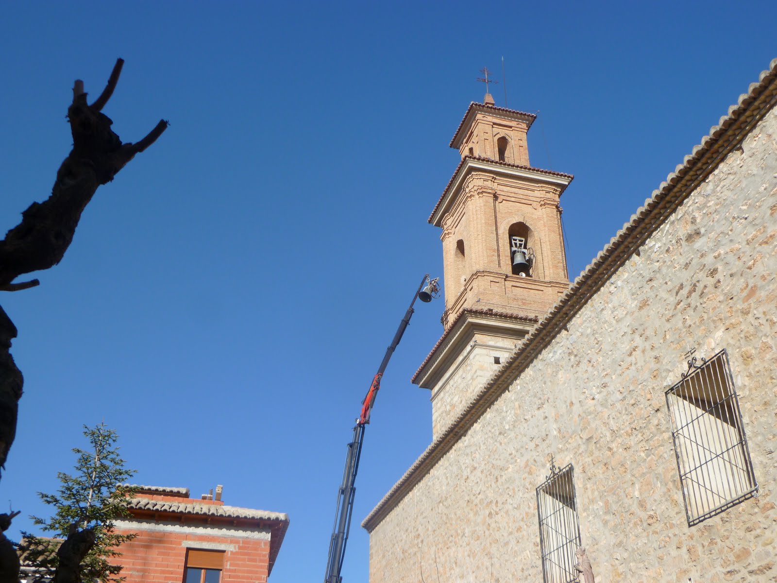 Aprovechando el estar la grua en la plaza de la Iglesia ,La Corporación Municipal decide retirar la torre de megafonía,ya que afinales del 2009 en la restauración del Ayuntamiento ,comprueban el peligro y deterioro de la torre,y desde hace aproximadamente dos años los altavoces de megafonía ,vuelven al campanario de la Iglesia.